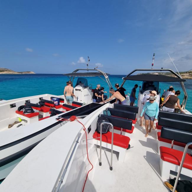 BOATS FOR 10–12 PEOPLE: Measuring from 7.50 to 10.00 meters, equipped with silent and environmentally friendly four-stroke engines, these boats offer real onboard comfort: sink, shower, seats, sun canopy, sunbathing areas, swim ladder…
